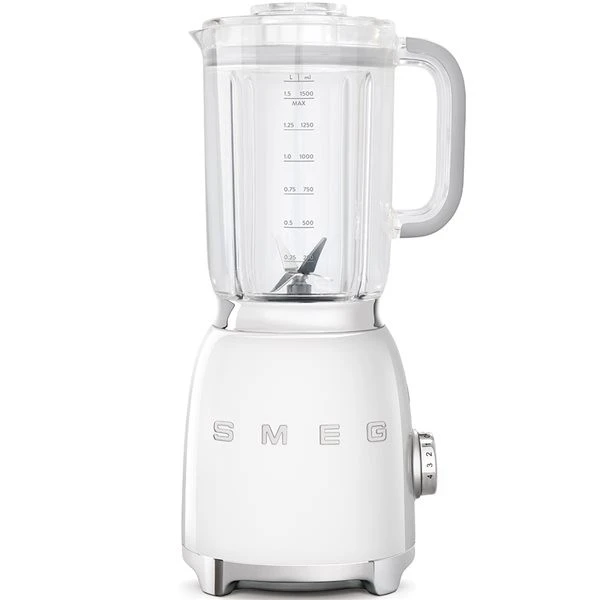 Batidora de vaso SMEG BLF01WHEU, 1,5 litros de capacidad, cuchilla doble extraíble, Línea años 50, 4 niveles de velocidad y potencia de 800W.