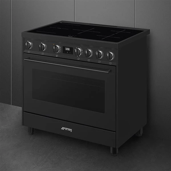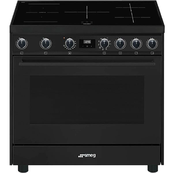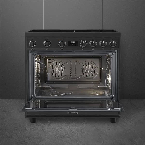 Si buscas un diseño y un funcionamiento excepcional, la cocina C91IEA9 de la marca Smeg incluye en el mismo aparato una placa de 5 zonas de inducción y un horno termoventilado de dos ventiladores clase A.